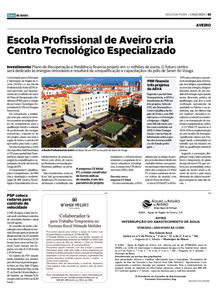 Escola Profissional de Aveiro Cria Centro Tecnológico Especializado Diário de Aveiro [05/08/2024] Veja também
